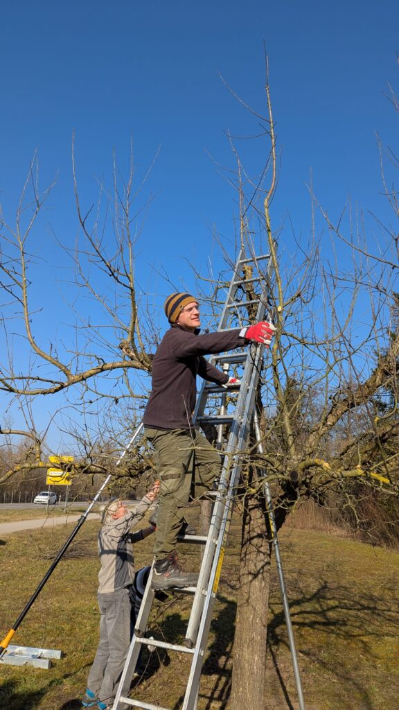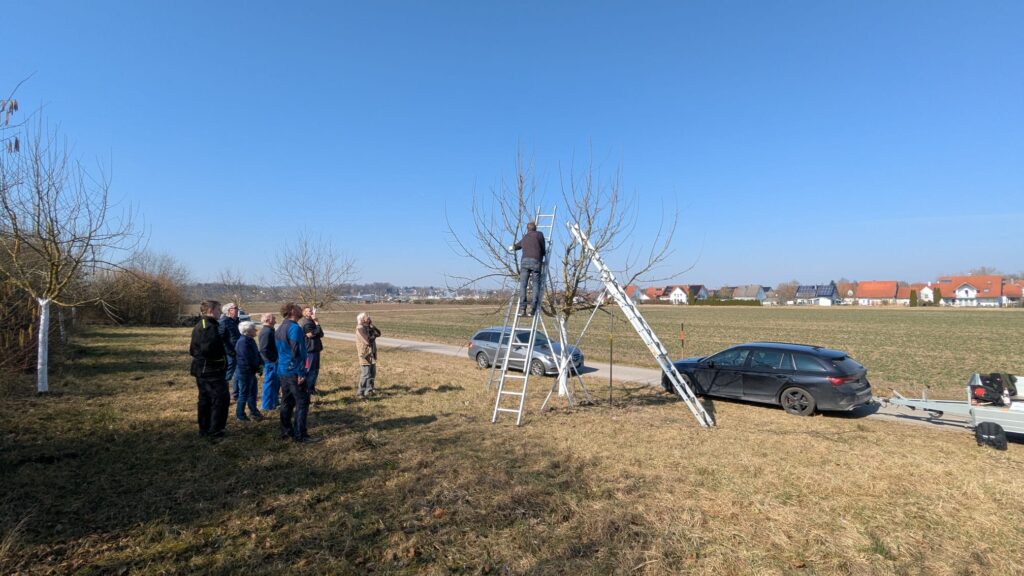 Der erste Teil endete gegen Mittag. Nach einer Pause trafen wir uns um 14 Uhr an der Gundremminger Straße, um das Gelernte an alten Obstbäumen anzuwenden. Dank der Helfer konnten wir an diesem Tag nicht nur Wissen vermitteln, sondern auch weitere Bäume pflegen und Schnittgut für die Abholung durch den Bauhof vorbereiten.
